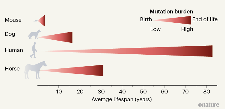除了增加癌症风险外,生物体一生中突变的积累被认为会损害细胞功能,从而导致器官衰竭和老年死亡7。长寿物种的低突变率也许是为了减缓一般的老化过程而进化的?