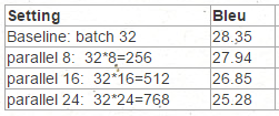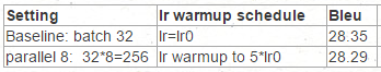 可以看到通过增加lr到5*lr0(理论上lr应该增加到8倍,但实际效果不好,因此只增加了5倍),并且通过warmup lr,达到和baseline差不多的Bleu效果。最终的收敛速度大约为5倍左右,也就是8卡能达到5倍的收敛加速(不考虑系统通信同步所消耗的时间,也就是不考虑系统加速比的情况下)。