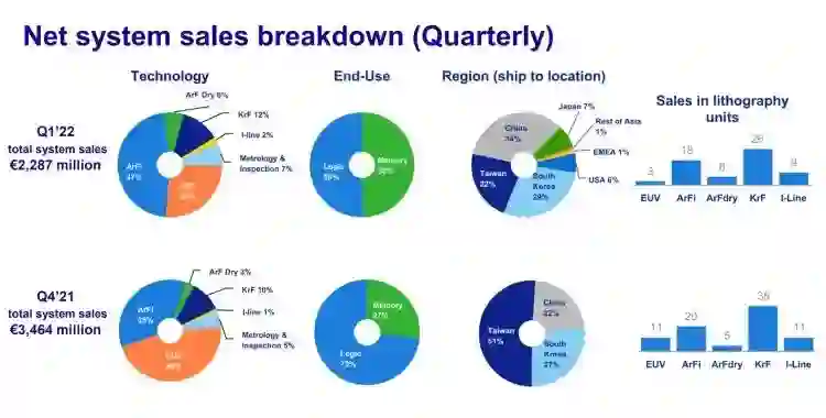 其次,从阿斯麦的营收来源地区可以发现,中国大陆地区的营收占比由去年Q4的22%上升到今年Q1的34%,成为阿斯麦本季度的最大客户,要知道中国大陆地区的芯片企业无法购入EUV,这意味着成熟制程的光刻设备市场需求异常强劲,恰恰市场上最缺乏的就是成熟制程芯片。