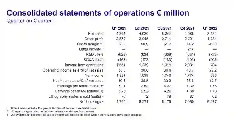 从芯片设备上阿斯麦近两天发布的财报中也能窥到缺芯风向的变化,首先是全球缺芯的大环境不变,阿斯麦表示仍需将产能提高50%以上,才能满足激增的订单量。在全球缺芯的基本盘不变的情况下,阿斯麦最新财报基本符合预期,阿斯麦2022Q1营收为35.34亿欧元,营收同比降19%,毛利率也由上季的54.2%降至本季的49%。
