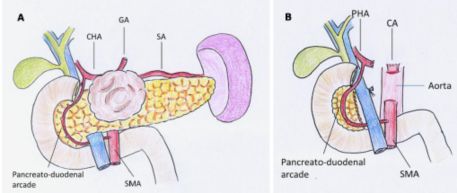 图3.肿瘤位于胰腺体部,侵犯CA和肝总动脉,切除后肝脏动脉血流通过胰腺十二指肠弓维持。