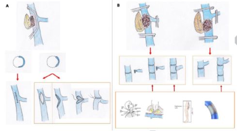 图2. 2A :肠系膜上静脉-门脉轴部分切除,若<50%血管环周,切除后缝合;>50%血管环周时切除,采用补片或横向折叠缝合。2B:肠系膜上静脉-门脉轴完全切除重建,根据肿瘤部位和静脉融合侵犯程度有不同的重建模式:断端直接缝合或植入物后缝合。