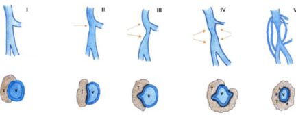 图1.血管肿瘤轴状接触面和肠系膜上静脉-门脉轴冠状面的不规则改变。I:肿瘤接触面<180°;II:肿瘤接触面<180°,过渡平滑;III: 肿瘤接触面<180°,单侧狭窄;IV: 肿瘤接触面>180°,双侧狭窄;V: 肿瘤接触面>180°,双侧狭窄与血管并行。I型可切除,II-IV型边界可切除,V型不可切除。