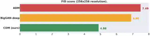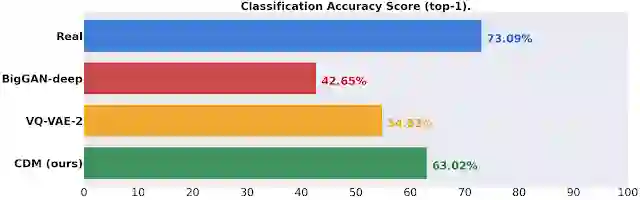 ImageNet 分类准确率在 256x256 分辨率下的得分,用以衡量利用生成数据训练的分类器的验证集准确率。与现有的方法相比,使用 CDM 生成的数据取得了明显的进步,缩小了真实数据和生成数据之间的分类准确率的差距(数值越高越好)