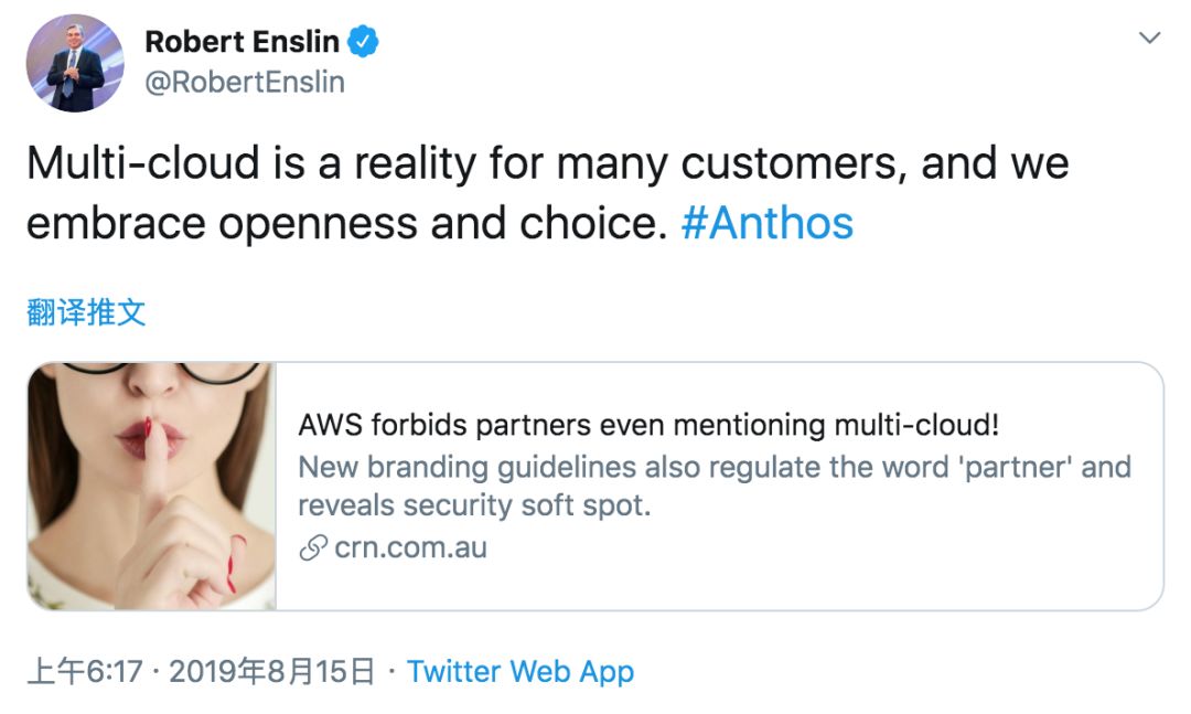 4月份以来出任谷歌云新任全球客户运营总裁的Robert Enslin昨天对这条推文回复如下:“对于许多客户来说,多云就是现实,我们拥抱开放和选择。”