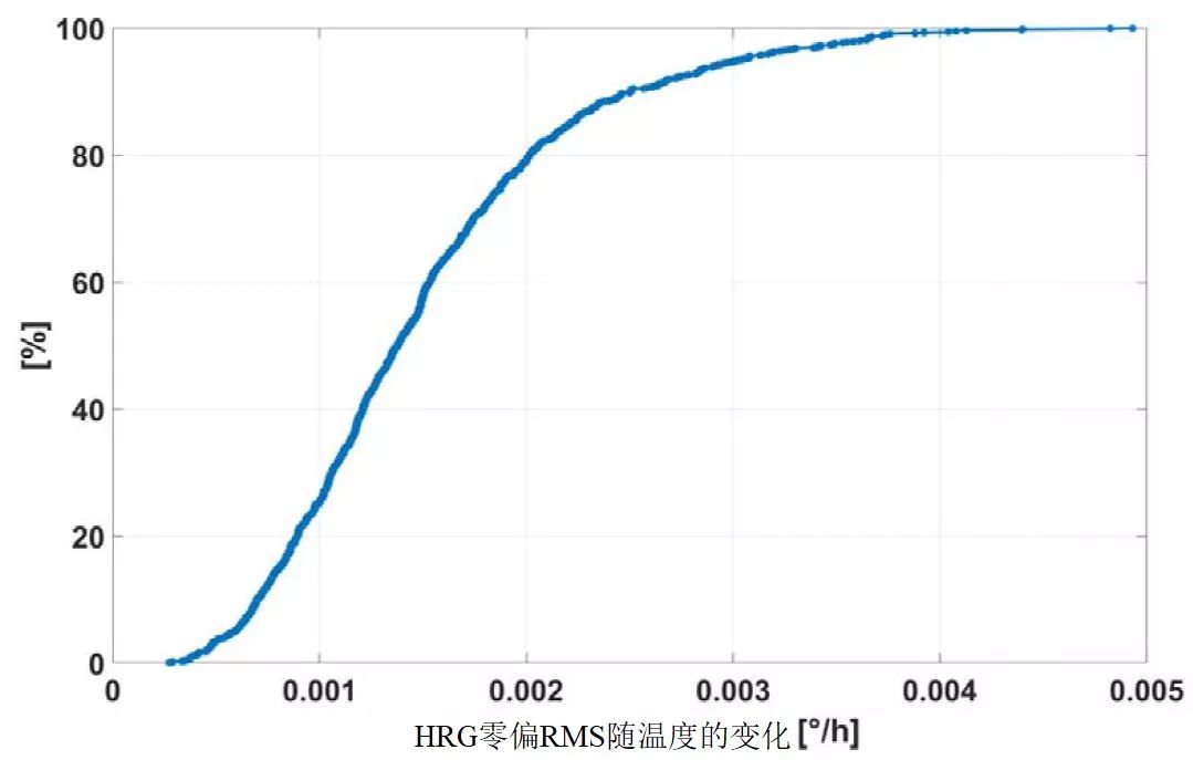绝对陀螺仪零偏误差是陀螺罗经方位角误差的关键。图12介绍了热校准后HRG零偏残余误差的总体密度(在-23 ℃~+80 ℃温度范围的RMS)。结果表明,100%的Crystal™ HRG符合零偏误差要求,且具有合适的余量。