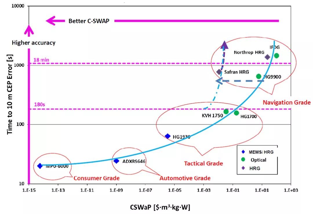 在DARPA公布的比较研究中,赛峰HRG被评为导航级领域中具有最佳成本、尺寸、重量和功率(C-SWaP)的传感器,可与霍尼韦尔公司的HG9900或诺格公司的HRG竞争。如图7所示,其它陀螺仪技术始终遵循性能与C-SWaP相关的趋势,而HRG正在改善这一趋势。
