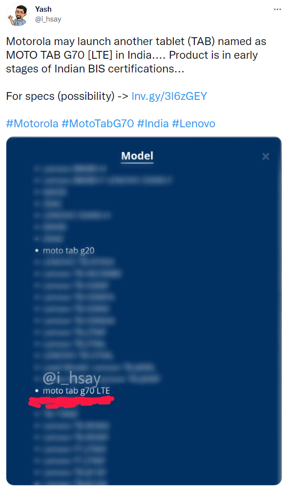 海外博主 @i_hsay 近日在 Twitter 上分享了一张“Moto Tab G70 LTE”的截图,消息称该机配备了 WUXGA+ 显示屏(分辨率 2000×1200),并且搭载了联发科 MT8183A 芯片组(或属于 Kompanio 迅鲲 SoC 家族)。印度标准局(BIS)网站也于近日公布了它的认证信息,表示 Moto Tab G70 拥有 4GB RAM 和预装的 Android 11 移动操作系统,这意味着摩托罗拉继上月推出了 Moto Tab G20 之后,或将很快推出更高规格的 Moto Tab G70 平板电脑。