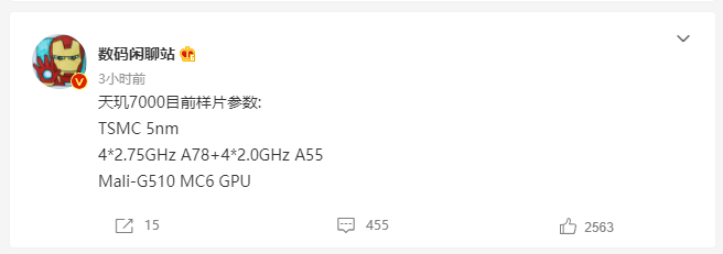知名博主 @数码闲聊站 今日曝光了联发科天玑 7000 的关键参数,使用的是基于台积电 5nm 工艺制程打造的 Cortex A78 架构,由 4 颗 Cortex A78 大核和 4 颗 Cortex A55 小核组成,CPU 主频最高为 2.75GHz,GPU 为 Mali-G510 MC6。相比起 Cortex-A77,Cortex A78 单线程性能提升 7%,能耗降低 4%。此外,联发科天玑 7000 的安兔兔综合成绩达到了 75 万分,超过了骁龙 870 的 70 万分左右。