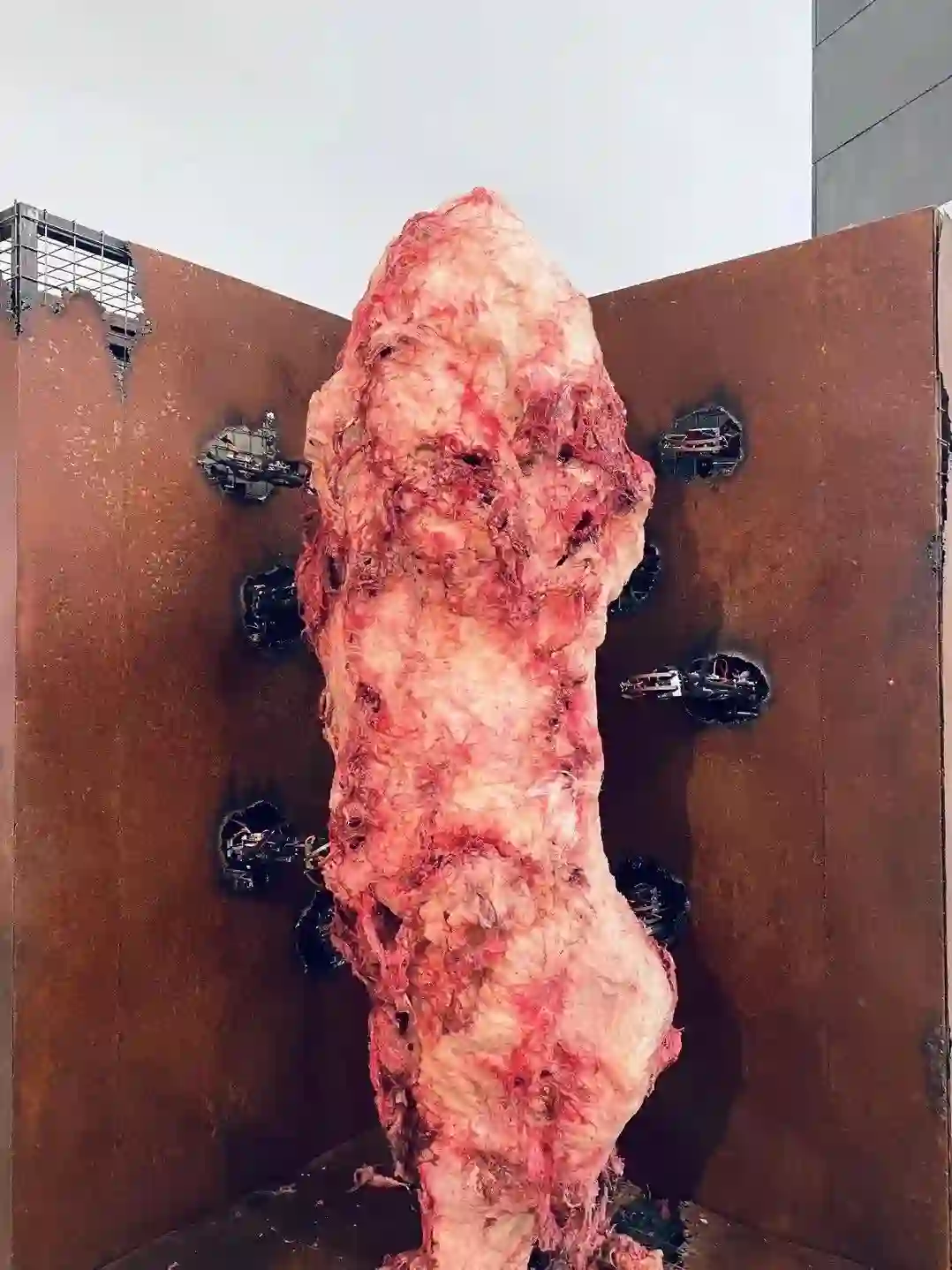 这个装置艺术是当时全场最吸睛的,乍一看到非常震撼,可以说自带焦点属性。不知道用的是什么材料,主体对肉感的模拟非常逼真,两侧是不停张开、闭合的捕肉器。