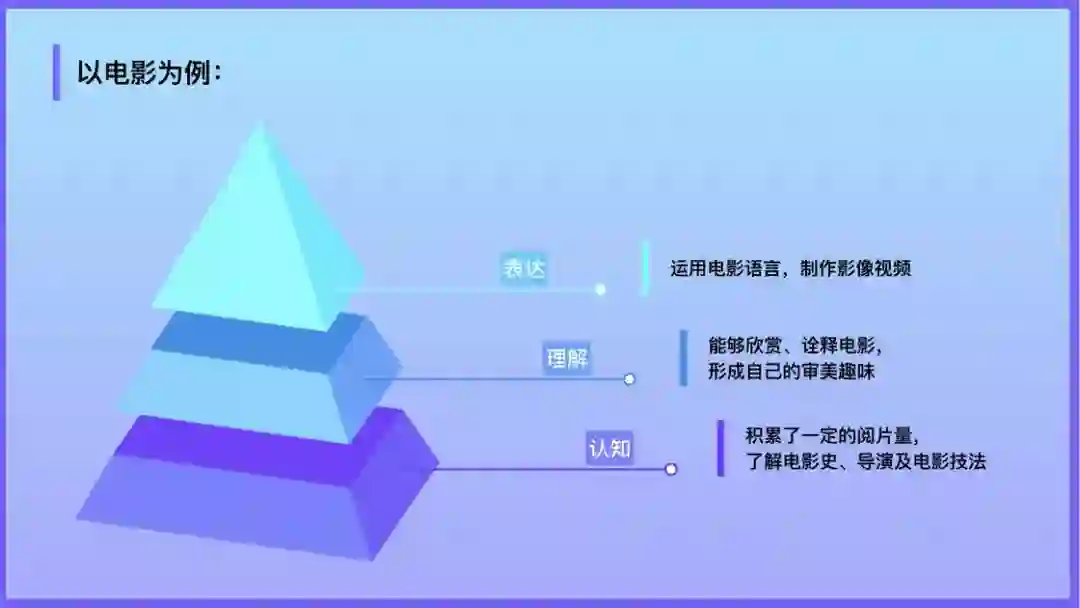用「现实以下」的方式进入生活,需要我们提升对生活的敏锐度,需要积累和自我教育。我将这个学习和感悟的过程简单抽象为一个进阶的三层模型:最基础的是「认知」,再往上是「理解」,最上一层为「表达」。以电影为例: