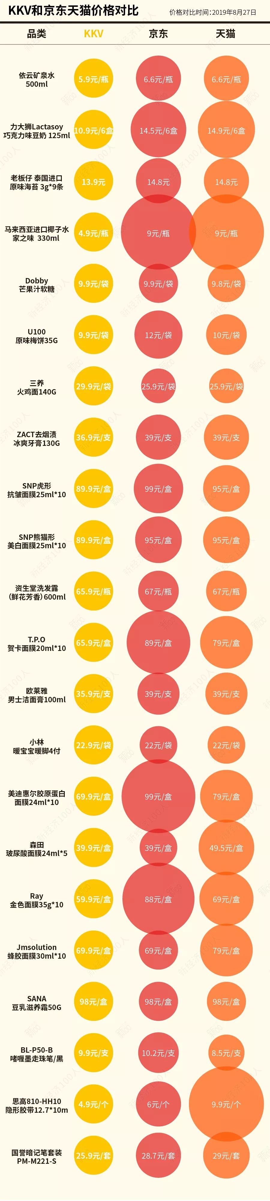 新经济100人抽样对比了KKV、京东、天猫的商品价格,抽样选取同规格、同种类的商品。结果如下图所示: