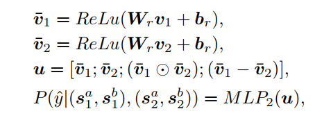 针对这个问题,本文借鉴自监督学习(self-supervised learning)的思想设计了一个关系的关系分类模块,要求输入两个句子,通过简单的启发式匹配,然后利用一个 MLP 进行二分类,模型图中的子图 D 展示了具体的结构,相关的过程可以表示为: