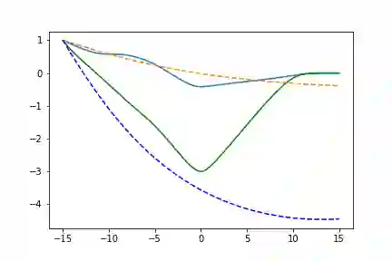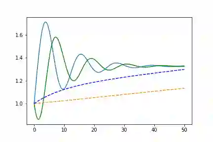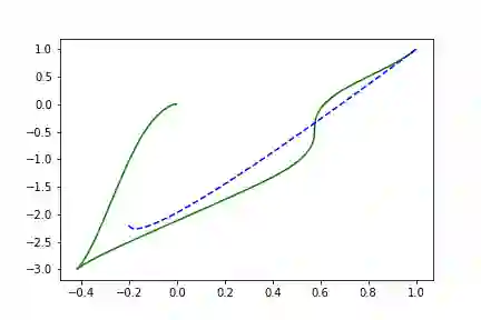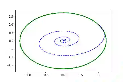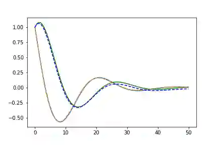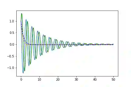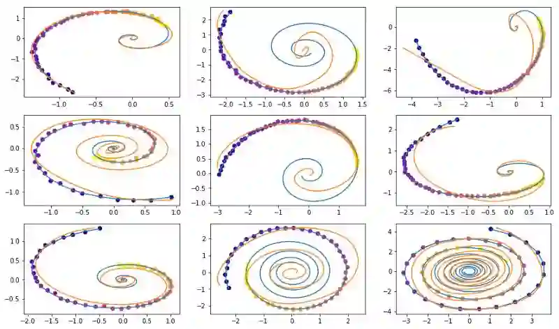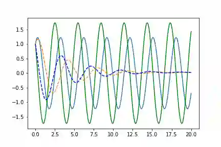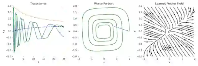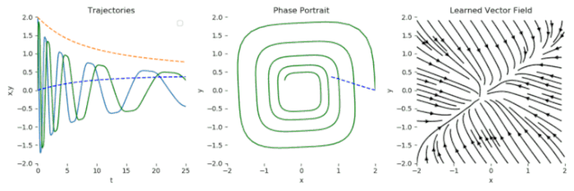 左边是相位空间,右边是时间空间。直线代表真实的轨迹,虚线代表由神经ODE系统学习的演化轨迹