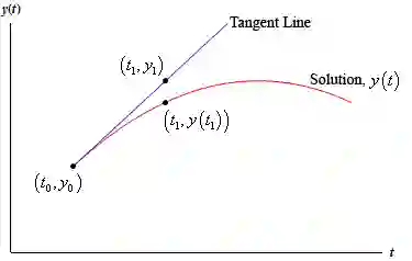 其中C1为常数,可以在给定初始条件时进行确定。如果以恰当的形式给出微分方程,我们可以用解析法进行求解,但通常是采用数值方法求解。最古老和最简单的算法之一是欧拉法:其核心思想是用切线逐步逼近求解函数:
