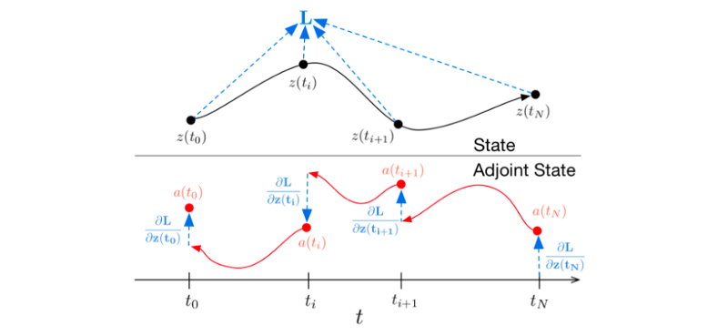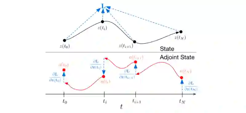 简单地说,伴随系统除了描述初始的动态系统的过程外,还通过链式法则(这就是众所周知的反向传播法的关键所在),描述了反向过程中每一点的导数状态。正是通过伴随系统,我们可以得到微分的初始状态,并以类似的方式,获得一个描述动态系统的函数(“残差块”或欧拉法离散化过程)的参数。