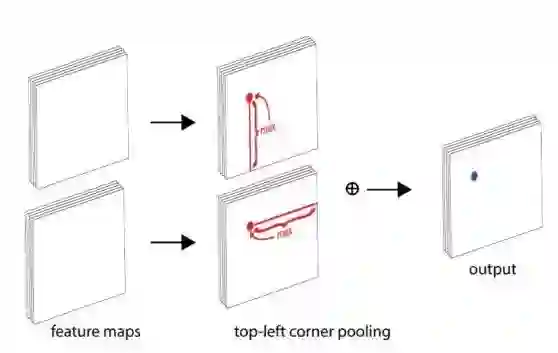 多数情况下,目标的角点都是在目标之外的,故角点处的特征缺乏语义及上下文信息,难以定位。故作者提出Corner Pooling来确定一个角点。简单来说,使用两个边界上响应最大的信息,经传递后叠加起来肯定也是全局最大的信息,即可确定左上角或者是右下角。