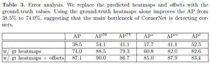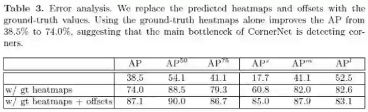 通过实验作者也验证了offsets模块可带来约10个点的提升,主要贡献来自于小物体的检测。另外呢,上表还透露出一个信息,那就是corner point的精准定位是算法的瓶颈问题,使用ground truth point 代替预测的corner point,AP从38.5提升至74.0。