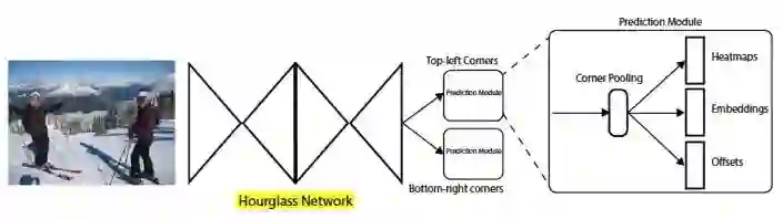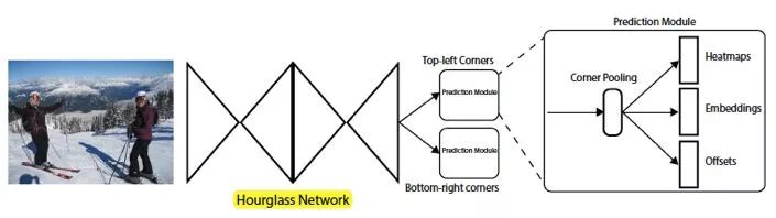 输入图像首先进入Hourglass网络部分进行关键点提取,而后通过左上角和右下角两个并行的预测模块来定位物体。这里的Hourglass网络广泛应用于人体关键点检测领域。我们分别来看Hourglass后的几个关键部分: