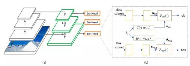网络延用RetinaNet结构,在P3~P7 5个特征层上做检测。作者解释建模 customized box prior bi的细节:anchor box 需要包含目标的坐标,类别,尺寸等信息。由于网络是全卷积的,所以坐标信息很容易从feature map 映射回原图得到;至于类别信息,作者将其建模于G(.;Wcls)中学习;最后是坐标信息,作者采用log(ahi/AH)传递bi的宽高与anchor box宽高间的关系,其中AW,AH为standard anchor box的宽高,起归一化作用。