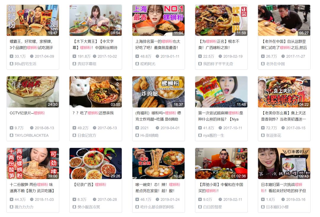 它俨然是个网红了,从众多地方小吃中脱颖而出,在B站上搜索“螺蛳粉”,有1千条视频,最高点击量一条有192万,试吃螺狮粉也成了海内外众多视频博主必“打卡”的成就。