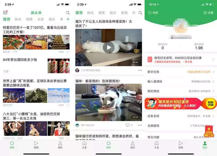 而趣头条同样作为个性化阅读 App 为自己找到的护城河,就是「给用户钱」——如果你每天就是想看看土摇视频、农村恶搞、八卦新闻和震惊体,那你在今日头条、手机百度、UC头条免费看,何不在趣头条一边领钱一边看呢?