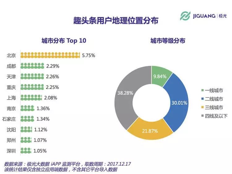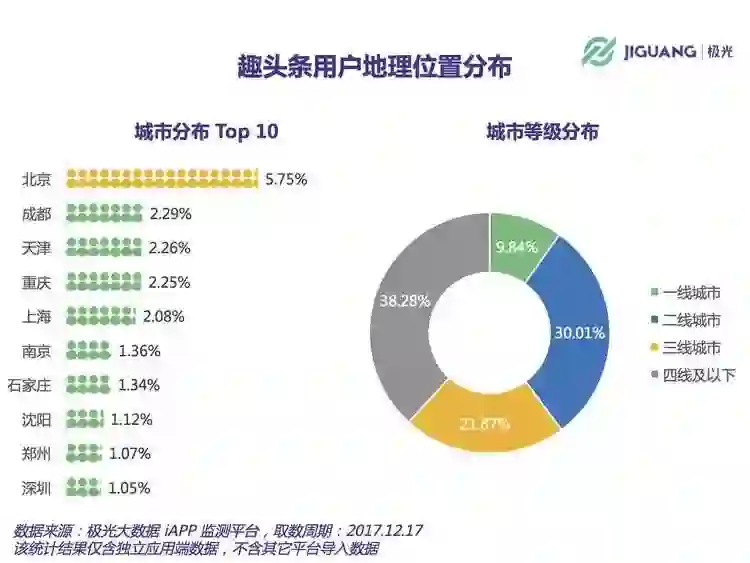 根据极光大数据的统计显示,趣头条用户中 30 岁以下的青年人和年轻人占 69.4%,而作为一款新闻阅读类客户端,趣头条的女性用户高于男性。而在地域分布上,二、三、四线城市的用户合并占比超过 90.15%。