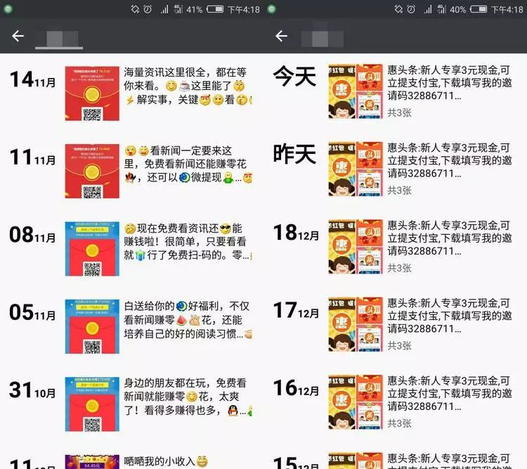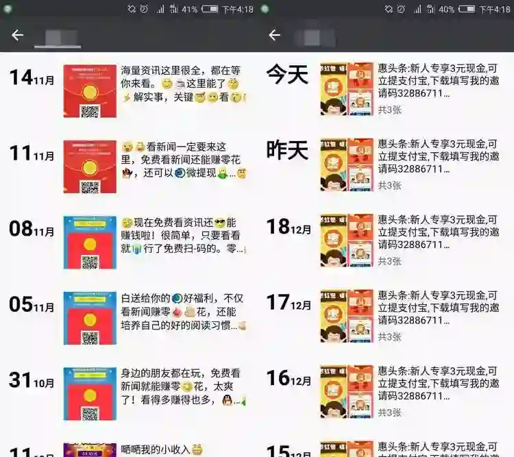 类似的收徒模式不止在趣头条一家使用,我的一个学妹向我展示了她母亲的朋友圈截图,其中左侧是在她母亲沉迷趣头条时的样子,而右侧则是她母亲下载了另一个叫惠头条 App 之后。