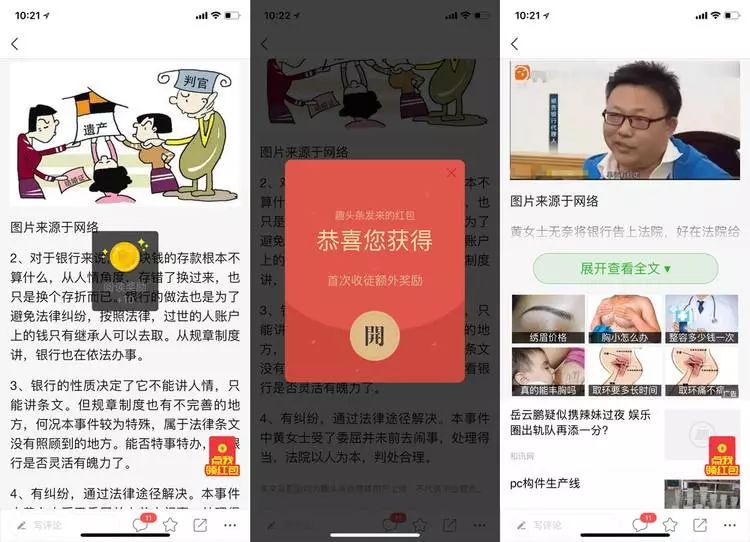 因为趣头条的用户在日常除了收徒之外,最主要的收入来源之一是「有效阅读」。根据趣头条的规则,每有效阅读一篇文章,可以获得10个金币。