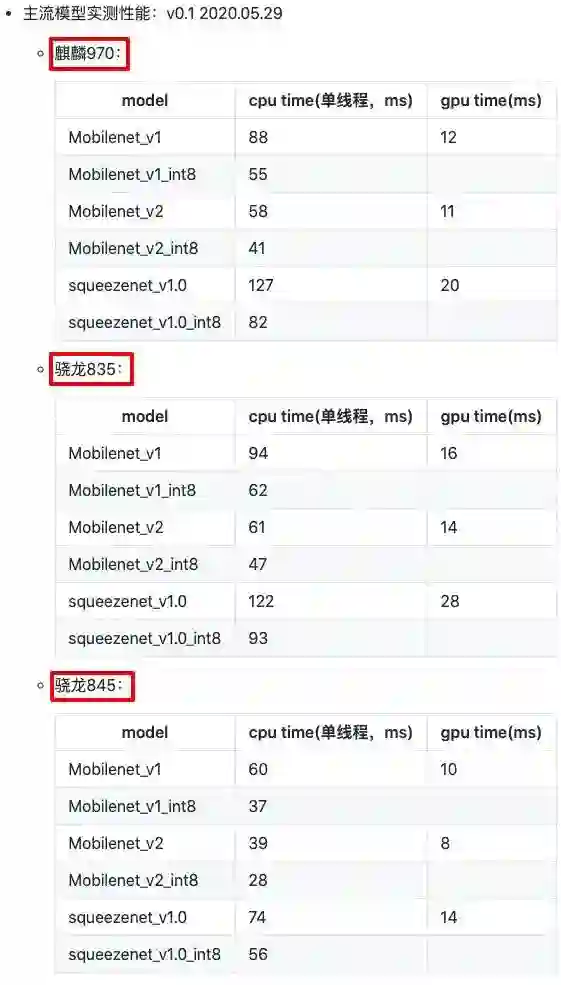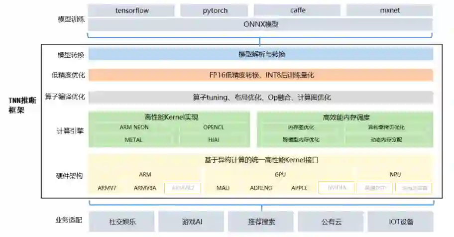 TNN对主流平台的适应性强,对CPU: ARMv7, ARMv8, GPU: Mali, Adreno, Apple) 深度调优。