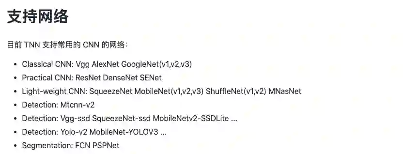 TNN框架在原有Rapidnet、ncnn框架的基础上进一步加强了对移动端设备的支持,在性能方面也有所优化,同时借鉴了业界主流开源框架的优点,高性能和良好拓展性。