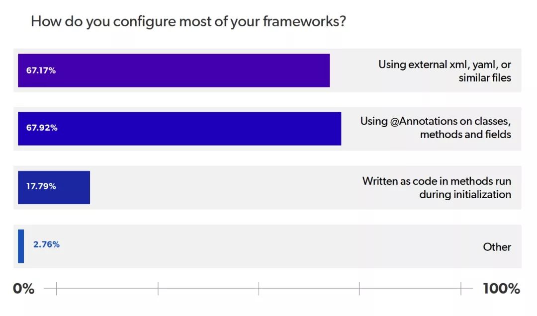 其中使用注解的用户占比67.92%,使用XML配置的占比67.17%,但是相信未来这个差距会越来越大。