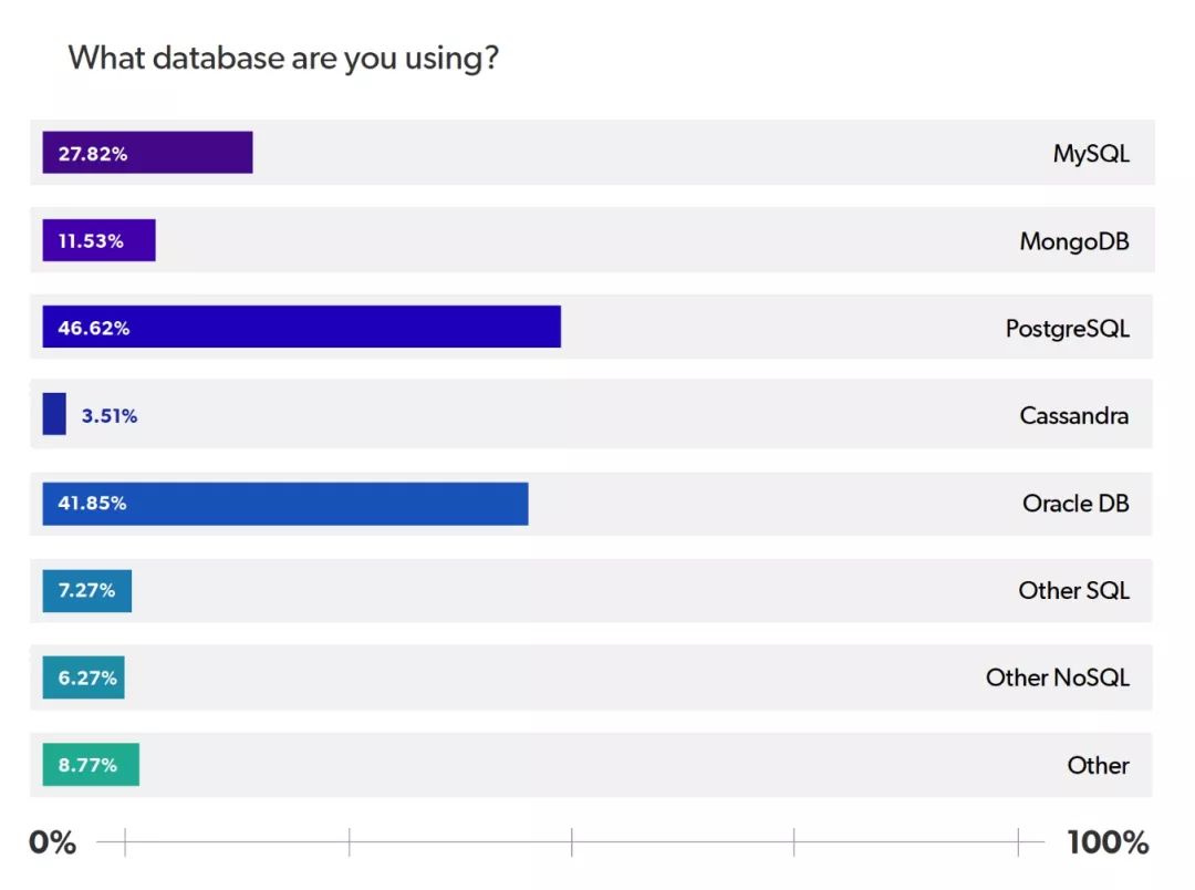 被问及使用最多的数据库是哪个,得到的答案是最受欢迎的是PostgreSQL (47%), Oracle DB紧随其后(42%)。其次是MySQL, 28%的受访者报告使用情况。MongoDB排名第四,有12%的受访者。