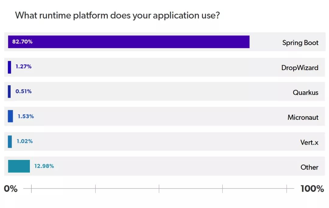 Spring Boot多年来一直是首选的Java框架。这很大程度上得益于最近几年微服务的流行。占比82%的用户选择使用SpringBoot,可以说,目前所有其他的运行时平台都是弟弟!