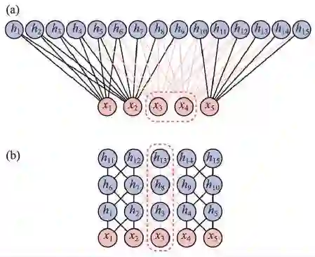 图2 两个不同架构,但参数个数相等的玻尔兹曼机(a)限制玻尔兹曼机;(b)深层玻尔兹曼机。红色虚线框中的神经元承载了网络左右部分的纠缠。一旦去除它们,网络就分成了独立的两部分。