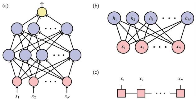 图1 几种参数化多元函数的方式(a)前馈神经网络;(b)限制玻尔兹曼机;(c)矩阵乘积态。