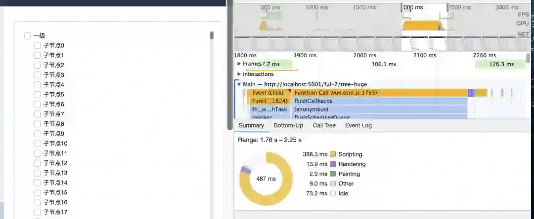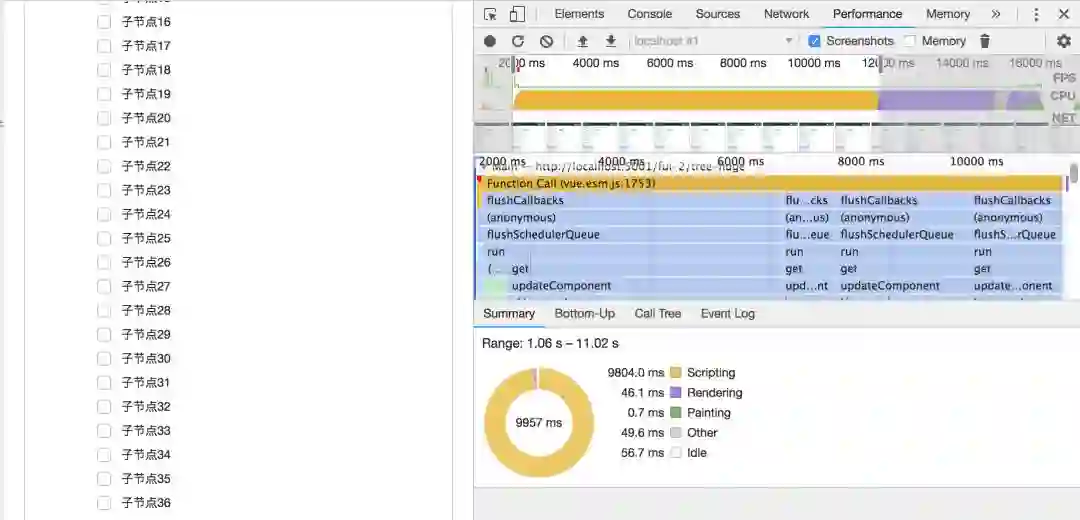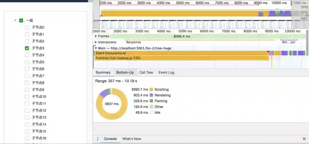 递归组件版 tree 点击节点性能分析图:点击节点处理速度: 10.19s - 0.357s = 9.833s ≈ 9.83s