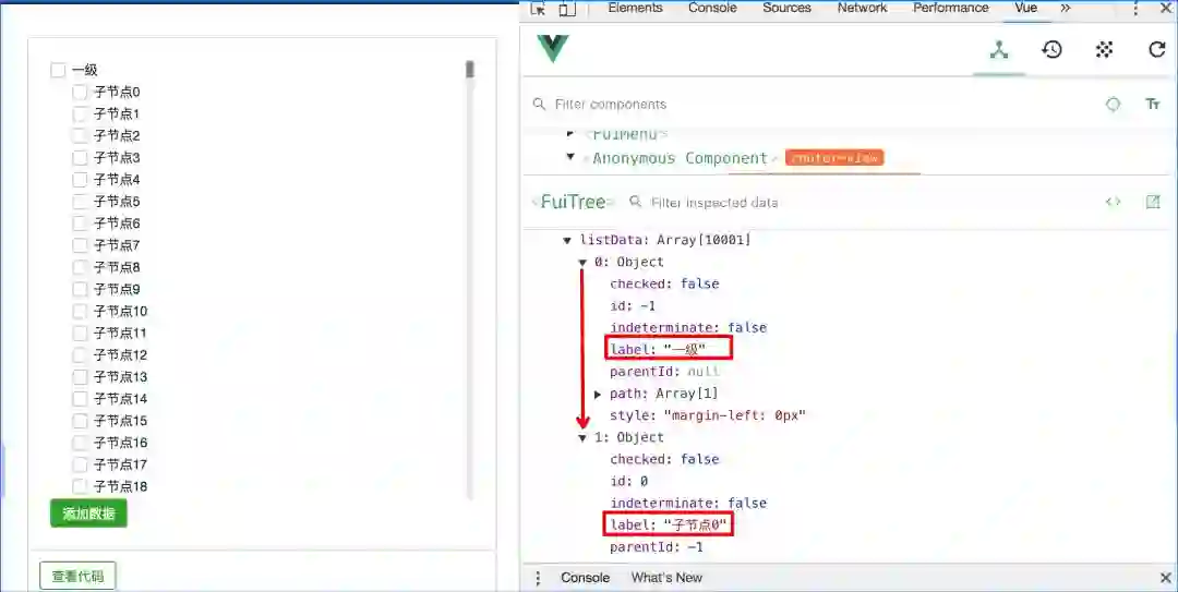 以上我们实现了业务需求的大数据渲染,目前测试可支撑到 20w 条节点,点击子节点时会有肉眼可见的延迟,主要是图 -12 中 handleCheckChange 的数据查找和处理,这块还有一定的优化空间:使用字典树存储节点相关信息,字典树和扁平数组 listData 的每一个元素指向同一个内存地址,在 handleCheckChange 中通过操作字典树来达到操作 listData 的元素的效果,经典的空间换时间的案例。