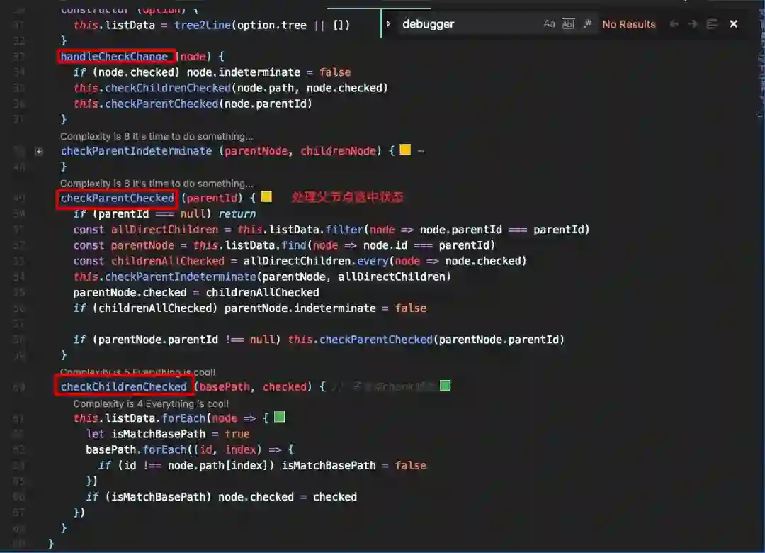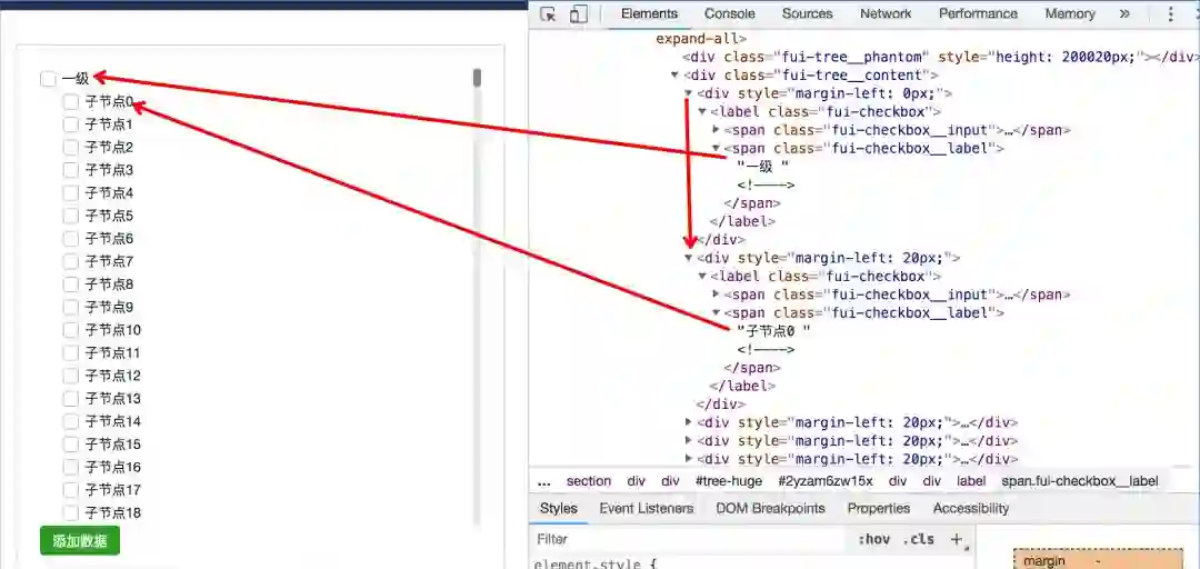 由上图我们可以看到经过改造之后的 tree 的 DOM 结构,父节点和子节点是平级的,在操作子节点时去操作内存中的 listData 数据来改变相关联节点的状态。