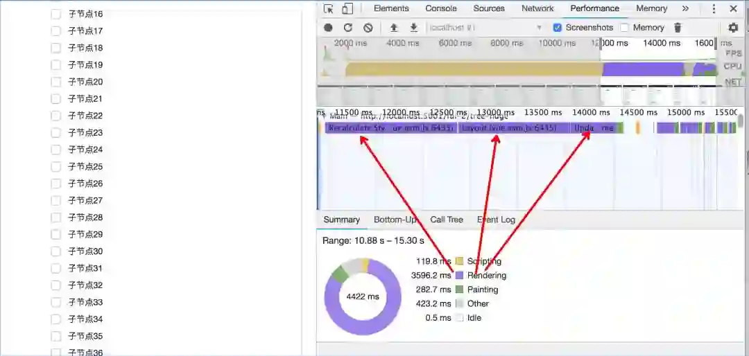 我们可以借助 performance 分析一下递归组件的耗时点所在,上递归组件渲染的性能分析: