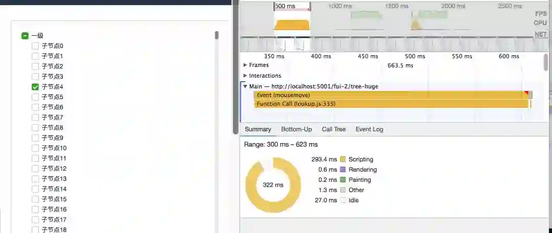 优化版 tree 点击节点性能分析图:点击节点处理速度 0.623s - 0.3s = 0.3s