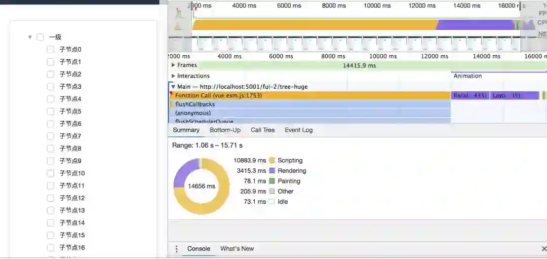 递归组件实现 tree:渲染速度 15.71s -1.06s = 14.65s