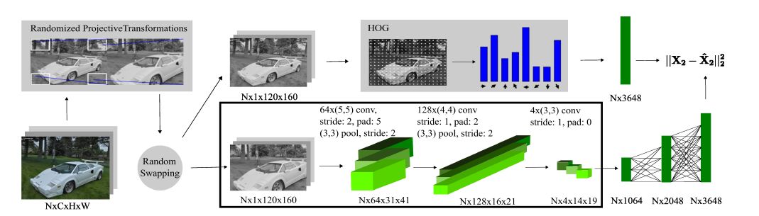 这个模型将高维的原始数据映射到有旋转不变性的低维的描述子空间。在训练之前,图片序列中的每一个图片进行随机投影变换,重新缩放成120×160产生图像对,为了捕捉运动过程中的视角的极端变化。然后随机选择一些图片计算HOG算子,采用固定长度的HOG描述子可以帮助网络更好地学习场景的几何。将训练图片的每一个块的HOG存储到堆栈里,定义为维度为