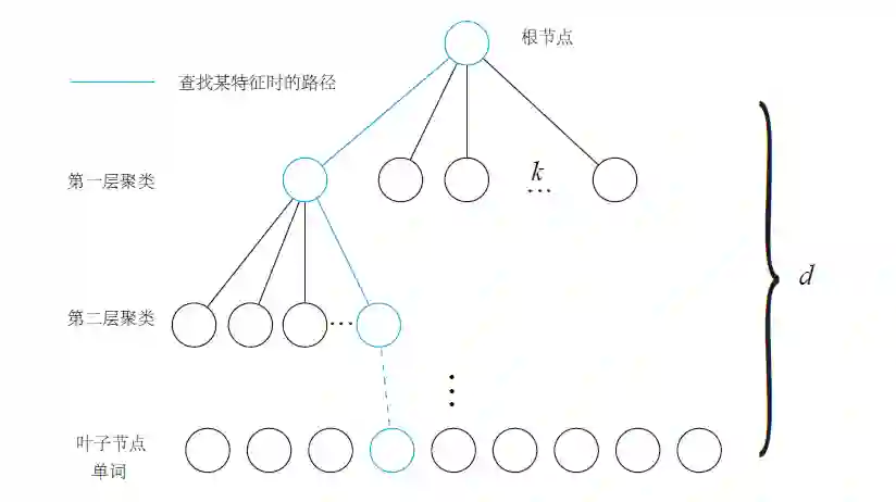 按这个循环,直到聚类的层次数达到阈值d,叶子节点表示一个word,中间节点则是聚类的中心。