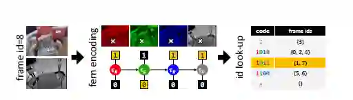 这种重定位方法将相机的每一帧压缩编码,并且有效的对不同帧之间相似性进行评估。而压缩编码的方式采用随机蕨法。在这个基于关键帧的重定位方法中,采用基于fern的帧编码方式:输入一个RGB-D图片,在图像的随机位置评估简单的二进制测试,将整个帧进行编码,形成编码块,每个fern产生一小块编码,并且编码连接起来可以表达一个紧凑的相机帧。每一个编码块指向一个编码表的一行,和具有等效的编码、存储着关键帧id的fern关联起来,编码表以哈希表的形式存储。