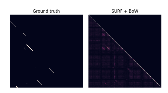 一些词在用来识别两个图像是否显示同一个地方比其他词更加有用,而有一些词对识别贡献不大,为了区分这些词的重要性,可以为每个词分配特定权重,常见方案是TF-IDF。它综合了图像中的词的重要性(TF-Term Frequency)和收集过程中词的重要性(IDF-Inverse Document Frequency),用以评估一个词对于一个文件或者一个语料库中的一个领域文件集的重复程度。