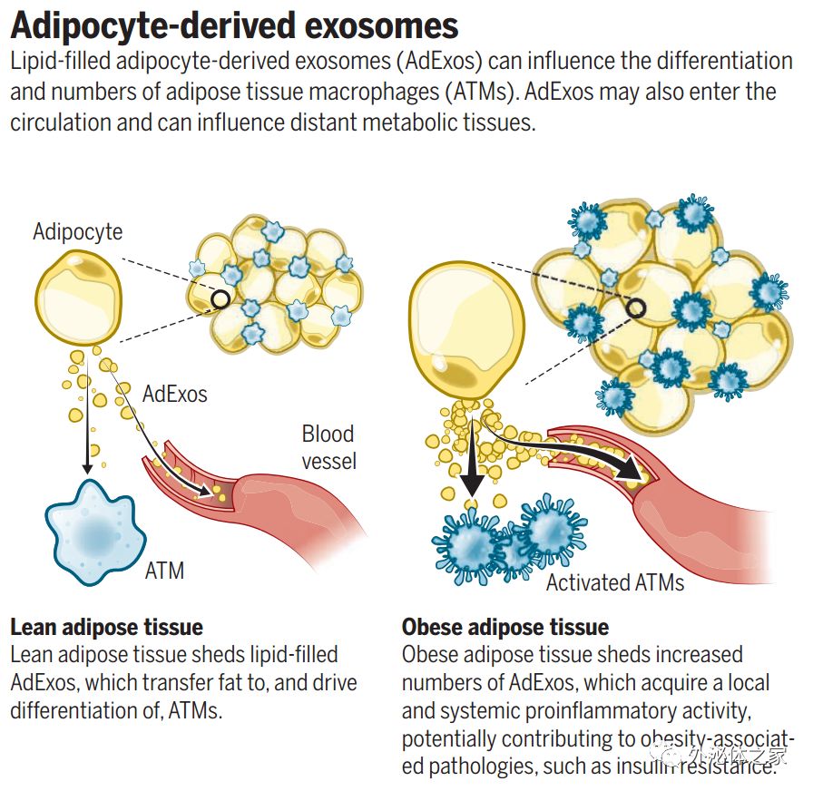 最新一期的Science杂志上,哥伦比亚大学的Flaherty等报道脂肪细胞通过释放称为脂肪细胞衍生的外泌体(AdExos)的不同类别的细胞外囊泡(EVs)与脂肪组织巨噬细胞进行通信,这种细胞外囊泡载有脂肪,直接源自脂肪细胞脂滴。脂肪组织巨噬细胞对AdExos的吸收实现了脂质的直接转移,在免疫功能和新陈代谢中起作用,揭示了一种细胞间通讯和营养交换形式,对肥胖相关病症机理的揭示具有重要意义。