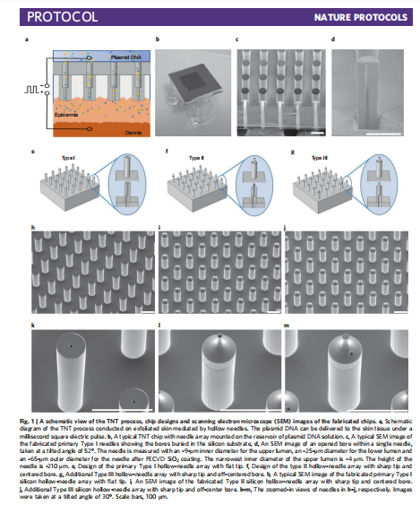 在这篇刊登于 Nature Protocols,名为 Fabrication and use of silicon hollow-needle arrays to achieve tissue nanotransfection in mouse tissue in vivo 的论文中,印第安纳大学的科学家们详细阐述了这种非侵入式且对人体无害的黑科技。