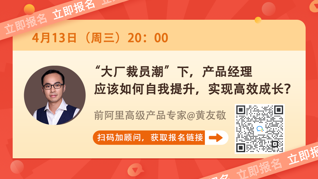4月13日(下周三),前阿里高级产品专家@黄友敬老师带你拆解产品经理9大必备核心能力,4个实用方法帮你快速提升产品能力,让你高效成长!