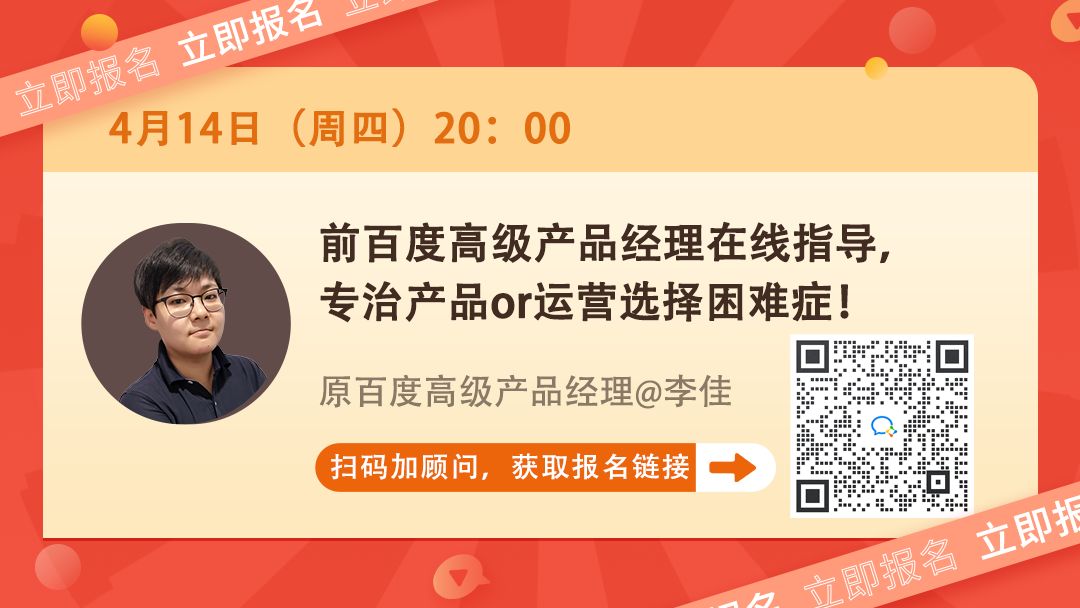 4月14日(周四)20:00,前百度高级产品经理@李佳 在线指导,专治选择困难症!帮你更好地认识产品和运营的联系与区别,判断自己适合产品还是运营,选择适合自己的职业方向!